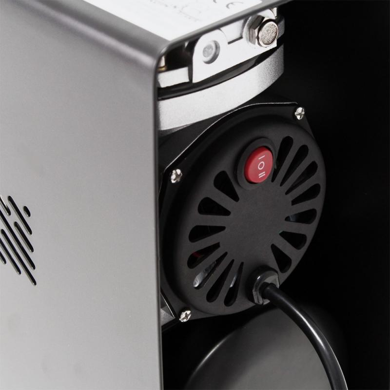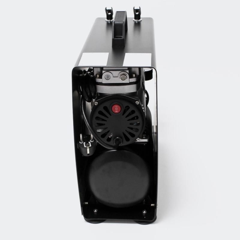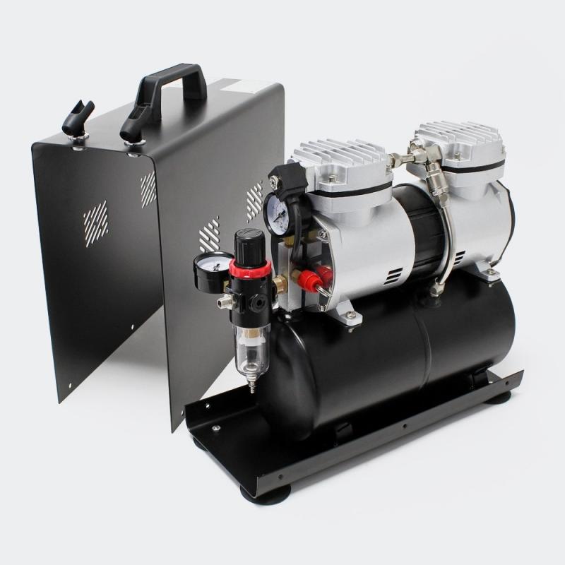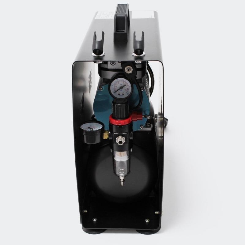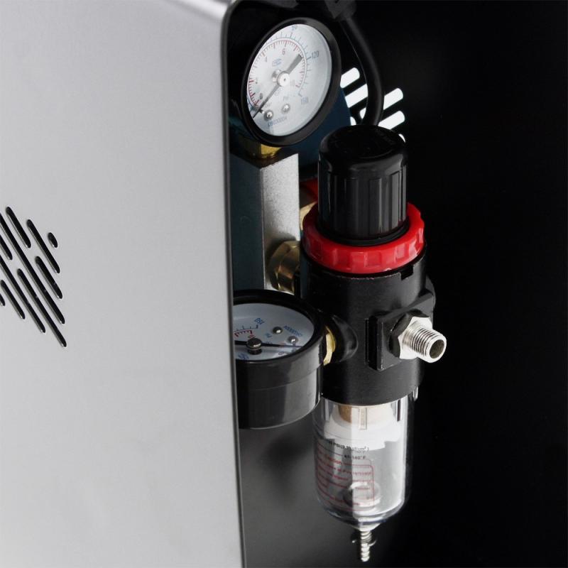 Den intelligenta lösningen: den ideala kompressorn med hög effekt för t.ex. airbrush, nybörjare, professionella modellbyggare, keramik, kosmetika, manikyr, tekniska bilder, tatueringar och NailArt studios. Lätt och bärbar och tyst med endast cirka 47 dB. Kompressorn arbetar automatiskt och är vibrationsfri och oljefri därav inga luftföroreningar. Inkl. vattenfilter, tryckregulator och manometer.