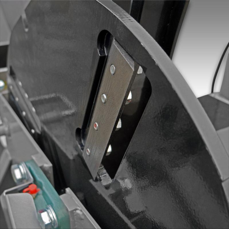 Materialtjockleken på denna flishugg säkerställer hållbarhet. Maskinen är designad för att vara lätt att underhålla och genom att lossa en enda skruv kan svänghjulskåpan öppnas för att komma åt de fyra skärbladen. Dessa skärblad är slipade på båda sidor så att de kan roteras vid behov.