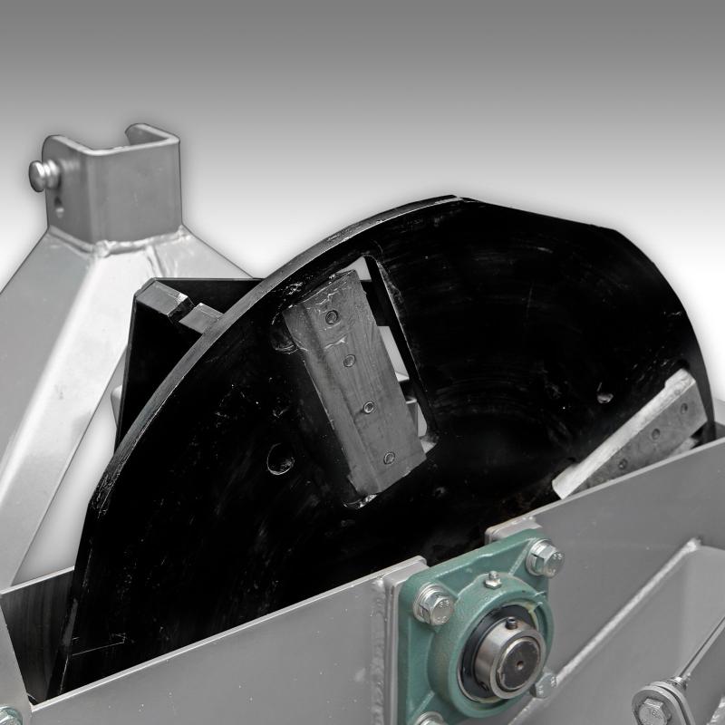 Enheten har konstruerats på ett mycket underhållsvänligt sätt. Du kan öppna svänghjulskåpan helt genom att skruva ut en skruv, vilket ger dig tillgång till de fyra skärbladen. Dessa skärblad är dubbelsidiga, så att de kan vridas om det behövs. Svänghjulet har en nettovikt på 50 kg och utrustade vingar, vilket ger den ett oerhört kraftfullt sug som släpper ut flisor ur rännan. Tack vare detta kraftfulla sug är en blockering i strimlarenheten praktiskt taget omöjlig.