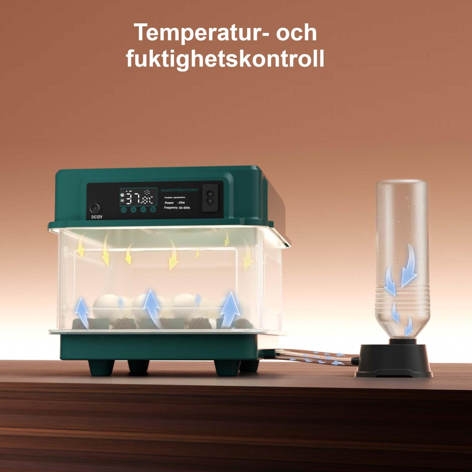 En konstant temperatur är avgörande för framgångsrik äggkläckning. Inkubatorn har en display för exakt temperaturinställning och övervakning. Ytterligare komponenter inkluderar en fläkt för god luftcirkulation och ett smart fuktighetskontrollsystem. En vanlig plastflaska (ingår ej) fylld med vatten skruvas fast på de små vattenbehållare som finns. Vattnet cirkuleras sedan långsamt och jämnt in i inkubatorn via ett tunt rör.
