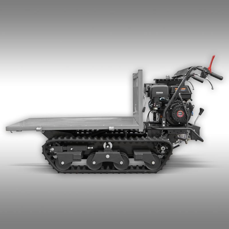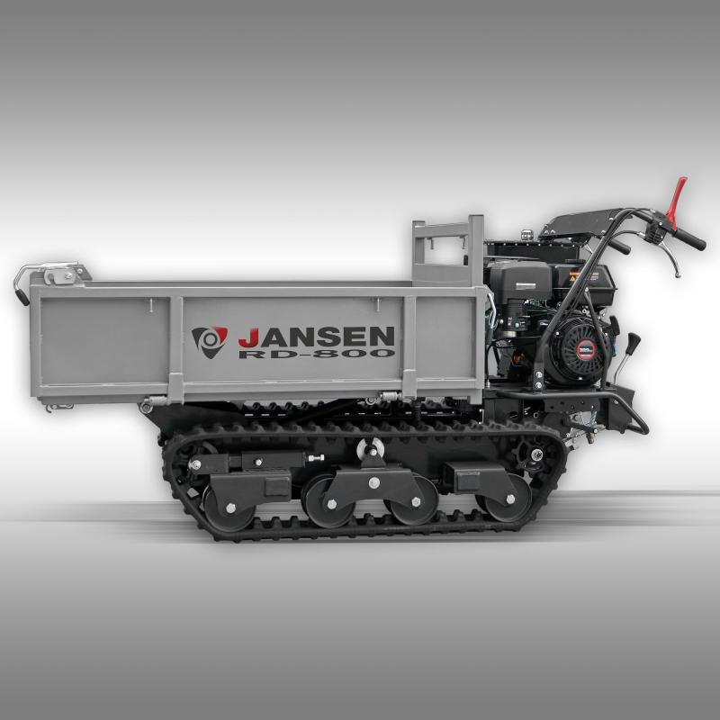 Den intuitiva, lättåtkomliga styrningen gör den extremt enkel och bekväm att använda. Den hopfällbara fotbrädan visar sig också vara extremt hjälpsam och bekväm på längre sträckor. RD-800 banddumper har en kraftfull 13 hk bensinmotor som startas med hjälp av dragsnöre. RD-800 är utrustad med ett tråg med fällbara sidoväggar som också kan tas bort helt för att använda den som en transportplattform. Även Euro-pallar (1200 x 800 mm) kan enkelt hitta plats på tråget - även när det är stängt!