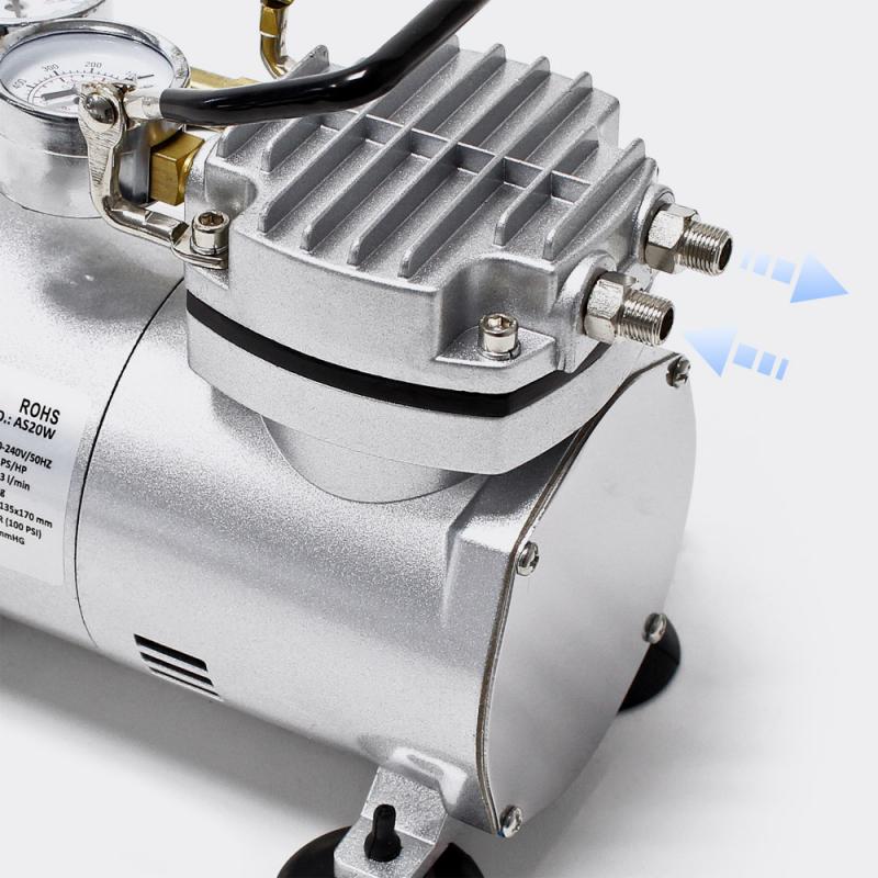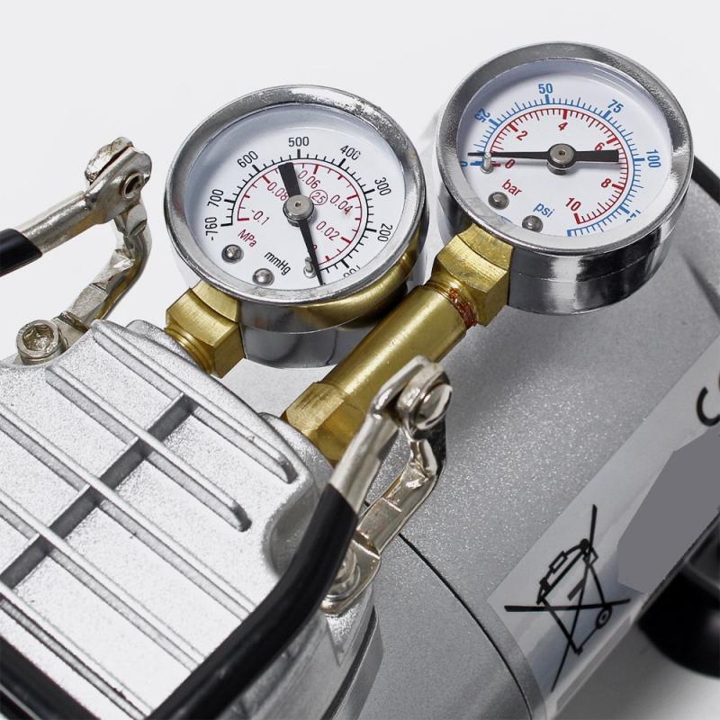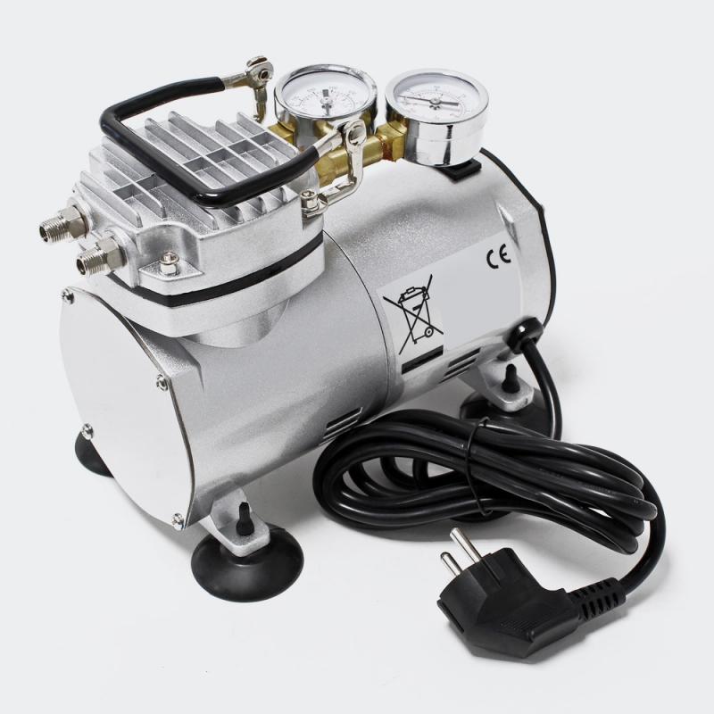 Den intelligenta lösningen: den ideala kompressorn med hög effekt för t.ex. airbrush, nybörjare, professionella modellbyggare, keramik, kosmetika, manikyr, tekniska bilder, tatueringar och NailArt studios. Lätt och bärbar och tyst med endast cirka 40 dB. Kompressorn arbetar automatiskt och är vibrationsfri, oljefri och därav inga luftföroreningar.