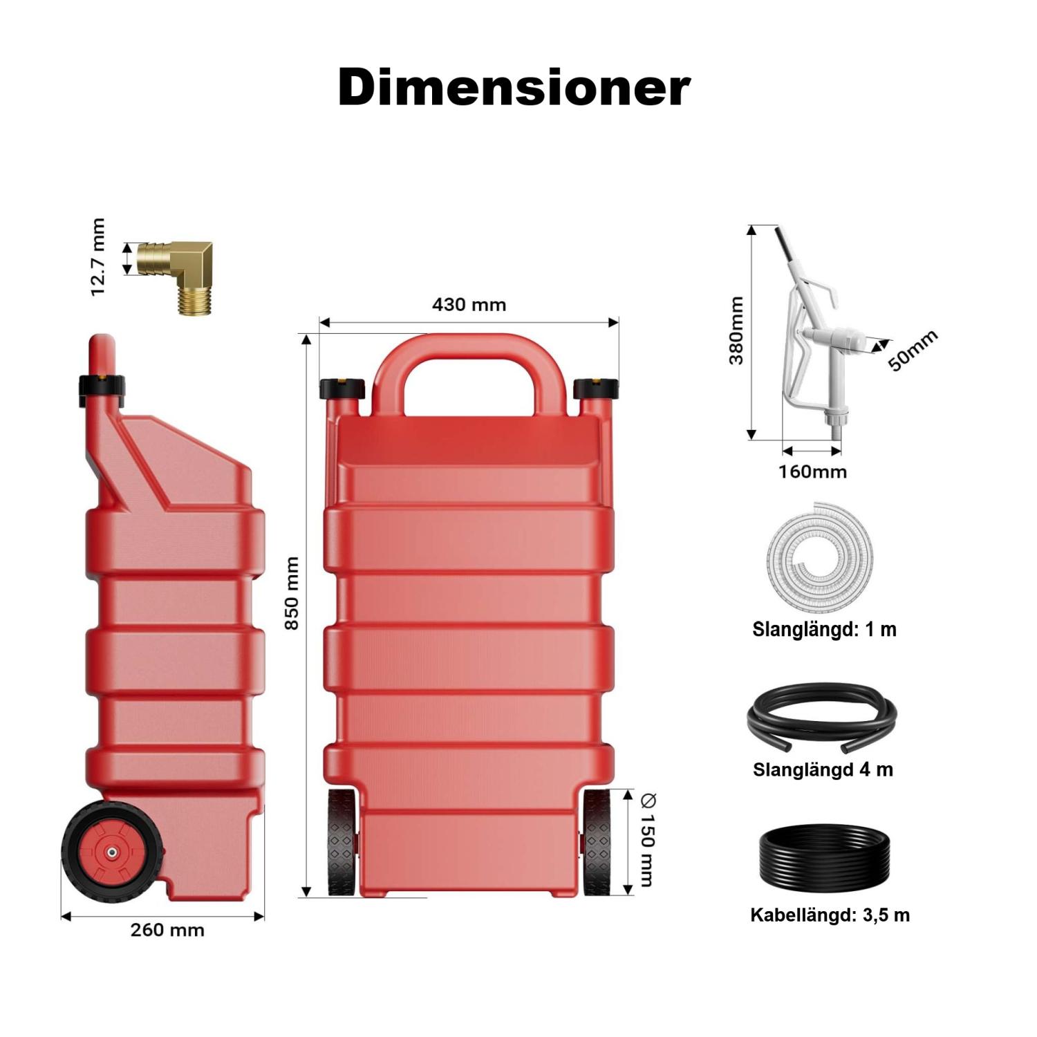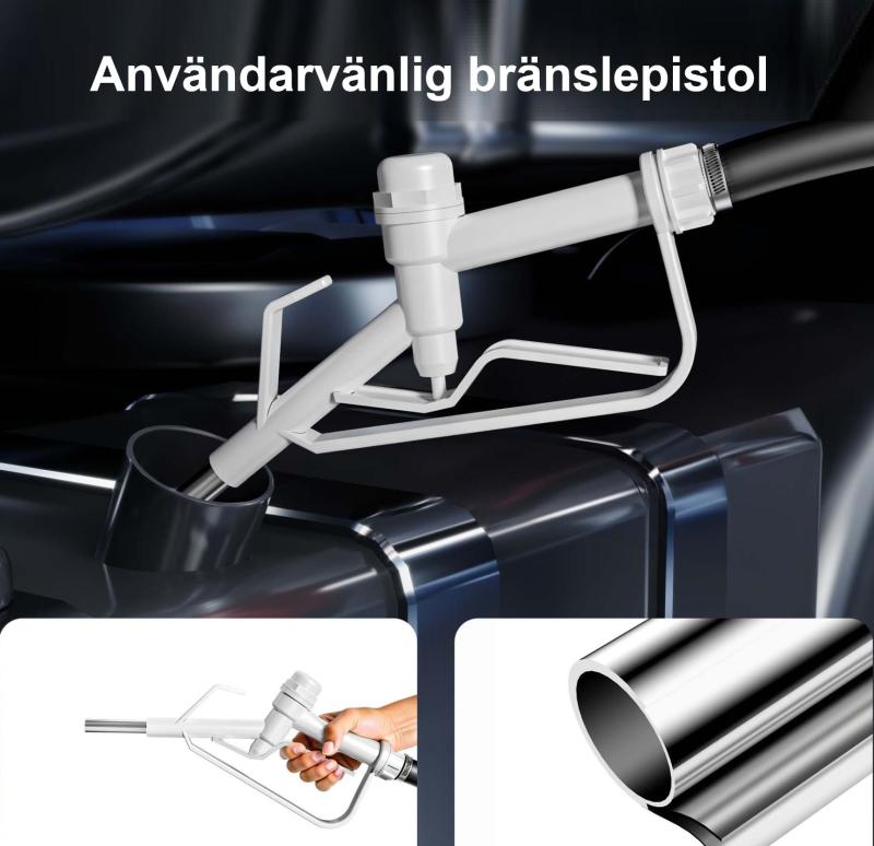 Denna bränsletank har en 4 meter lång kabel med batteriklämma, vilket säkerställer flexibla alternativ. För maximal flexibilitet kan den även drivas med en 12V-kontakt. Den portabla bränsletanken är utrustad med en 1 m sugslang för påfyllning och en 2 m leveransslang för tankning. Det medföljande tankpistol säkerställer exakt kontroll av bränsleflödet.