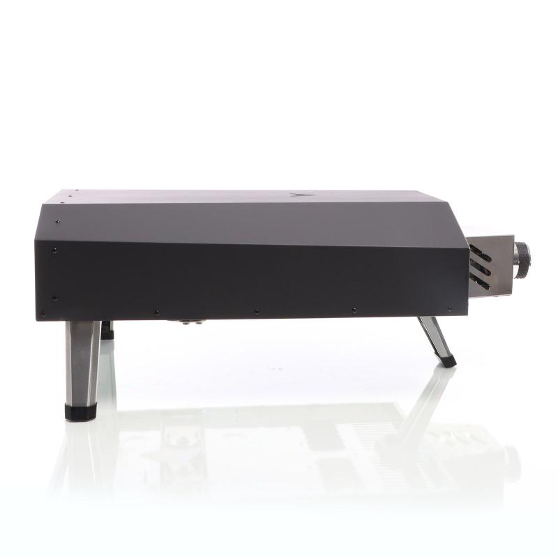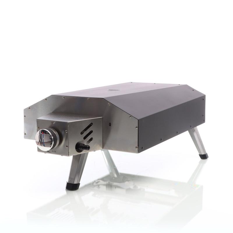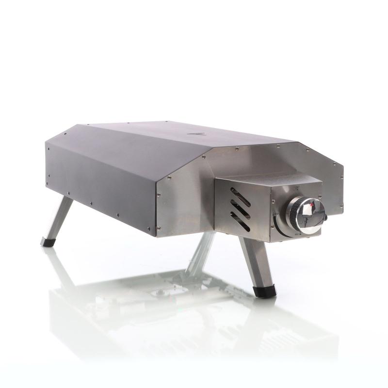 Med den gasdrivna pizzaugnen med roterande funktion kan du få nybakad pizza precis när du vill. Pizzaugnen på 510 x 730 x 255 mm är portabel och kan enkelt användas utomhus. Oavsett om den är på balkongen, i trädgården eller till och med på semester är ugnen lätt att ta med sig. Dess tre ben kan fällas ihop för transport. Väl på önskad plats viks dess ben ut, fixeras och pizzaugnen ansluts till gasen.