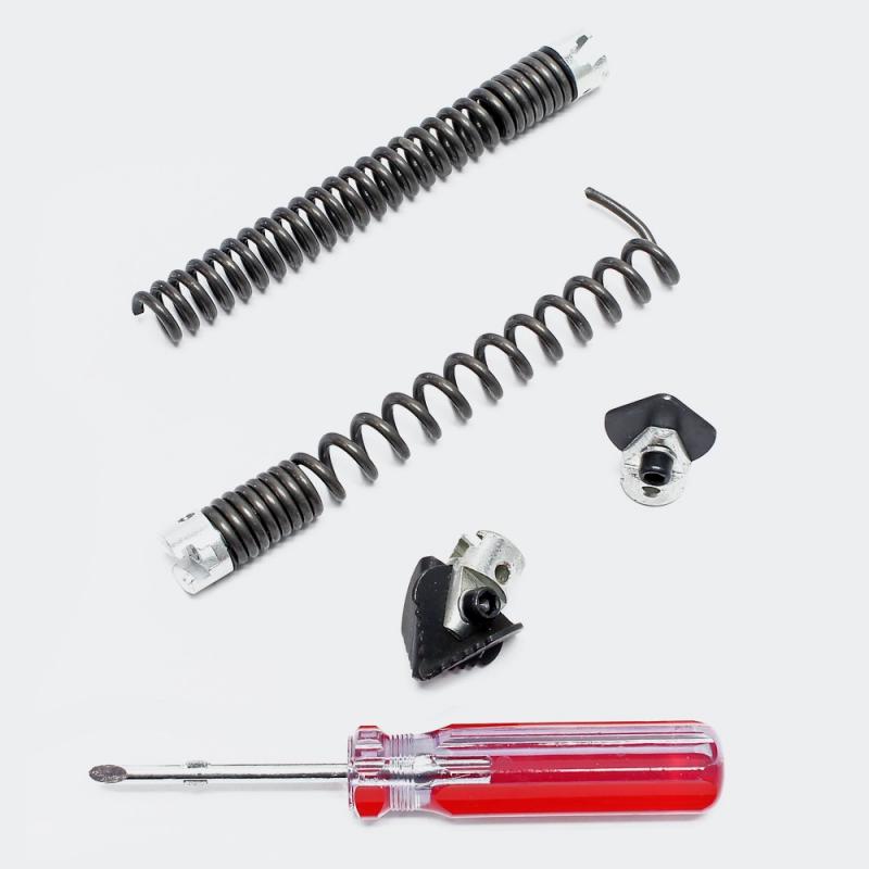 Förutom den elektriska rengöringsmaskinen omfattar leveransen även 6 löstagbara rör rengöringsspiraler Ø 16 mm, 2,3 m (totalt med en längd på 13,8 m) av kvalitets fjäderstål, en spiralkorg, skyddshandskar och 4 olika borr- och skärhuvuden. En uppsättning med olika tillbehör ingår också.