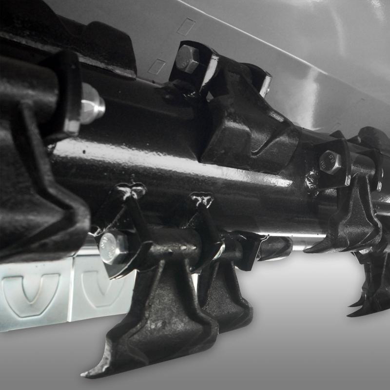 Den uppfällbara underhållsluckan ger åtkomst till axeln, vilket gör det ännu enklare att byta hammarenheter och utföra underhåll. De 24 inbyggda 400 grams tunga hamrarna krossar klippmaterialet till ett minimum. Även väldigt högt gräs, buskar eller halm är inga problem med denna klippare. Tack vare de stora, stabila pneumatiska däcken kan klipparen lätt flyttas, även på mycket ojämna ytor.