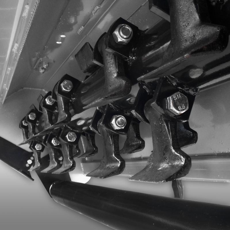 Den gångjärnskonstruerade underhållsklaffen ger åtkomst till spindelaxeln, vilket gör det ännu enklare att byta hammare och alla underhållsarbeten. Vi vill påpeka att, enligt de svenska föreskrifterna för förebyggande av olyckor, måste underhållsklaffen stängas vid klippning för att förhindra att stenar etc. flyr. Den tyngsta växellådan i sin klass har installerats i denna slaghack. Till skillnad från gräsklipparna som är utrustade med lätta Y-blad, har denna slåttermaskinen de bästa prestandaegenskaperna tack vare den höga svänghjulsmassan, som är ett resultat av de tunga hammarbladen och det tyngre skaftet. De 24 specialhärdade, 0,8 kg hammarknivarna hackar materialet till ett minimum. Den dubbla spiralrotorn med sin jämna rotorbelastning säkerställer särskilt smidig körning och lång hållbarhet med betydligt mindre ansträngning. Även mycket högt gräs, buskiga eller halmklipp är inga problem med denna gräsklippare!