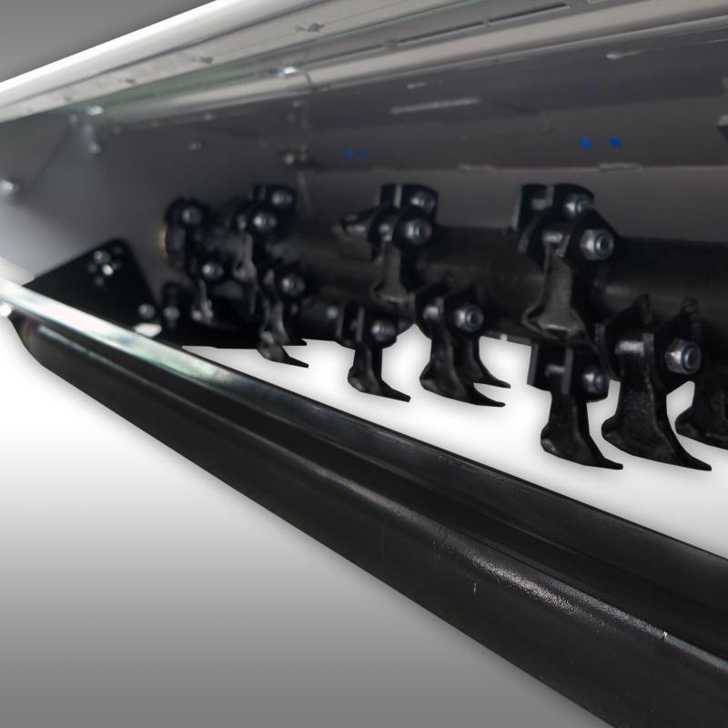 Den tyngsta växellådan i sin klass  har installerats i denna slaghack. Till skillnad från gräsklipparna som  är utrustade med lätta Y-blad, har denna slåttermaskinen de bästa  prestandaegenskaperna tack vare den höga svänghjulsmassan, som är ett  resultat av de tunga hammarbladen och det tyngre skaftet. De 32  specialhärdade, 0,8 kg hammarknivarna hackar materialet till ett  minimum.