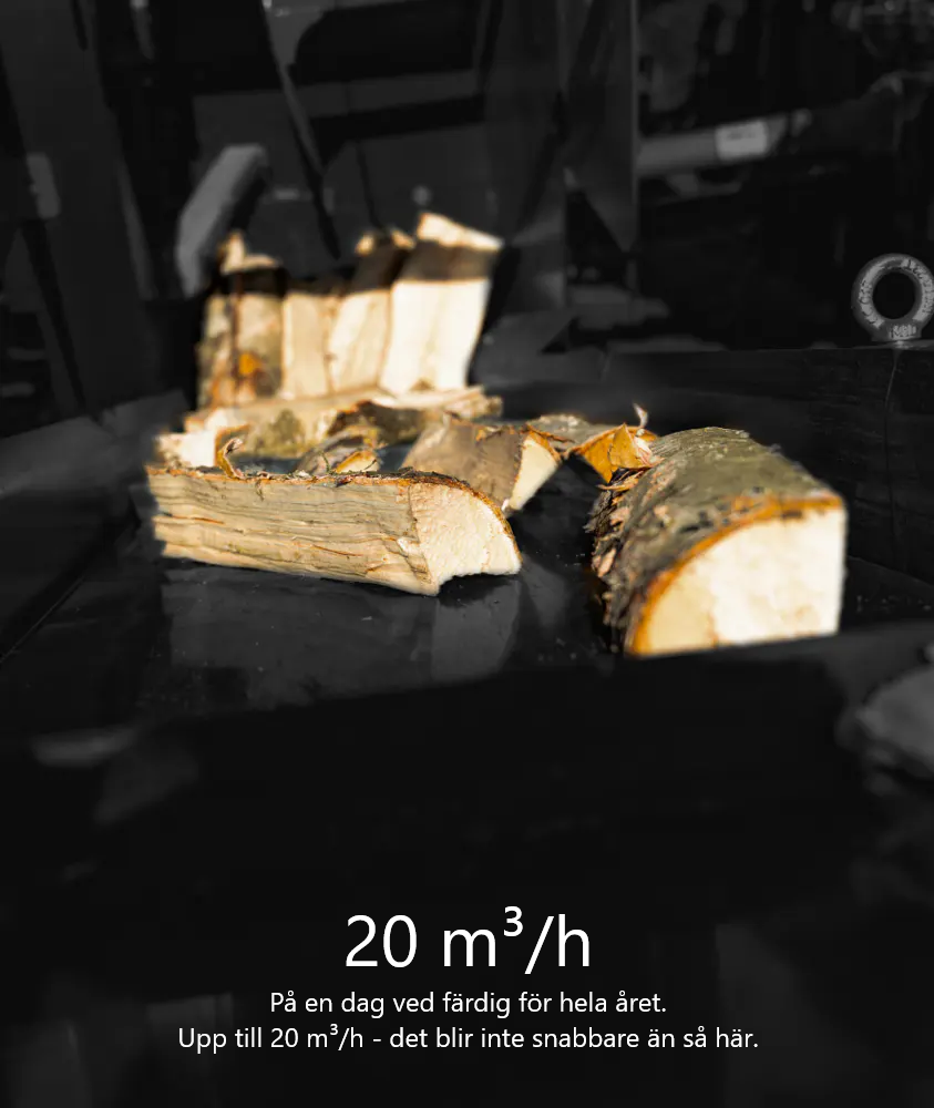 Med Mehoma vedmaskin kan du göra allt i ett svep, från rundstockar till färdigladdad ved. Ingen flyttning. Inget omarbete. Bara montera den, sätt igång och producera hela vinterns vedförråd på en enda dag!