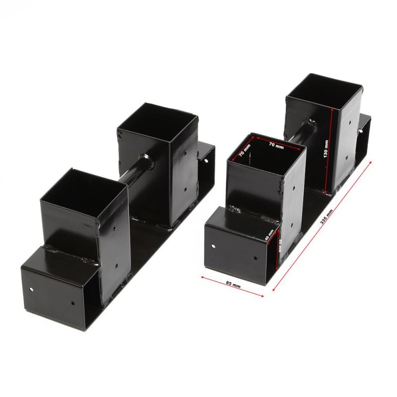 Hållaren har måttet: 34 x 10 x 15 cm. Den vertikala öppningen på 70 x 70 mm och den horisontella öppningen på 40 x 60 mm är perfekt lämpade för att matcha fyrkantigt virke. Hållarna av pulverlackerad stål har förborrade hål för en enkel fixering av virket.