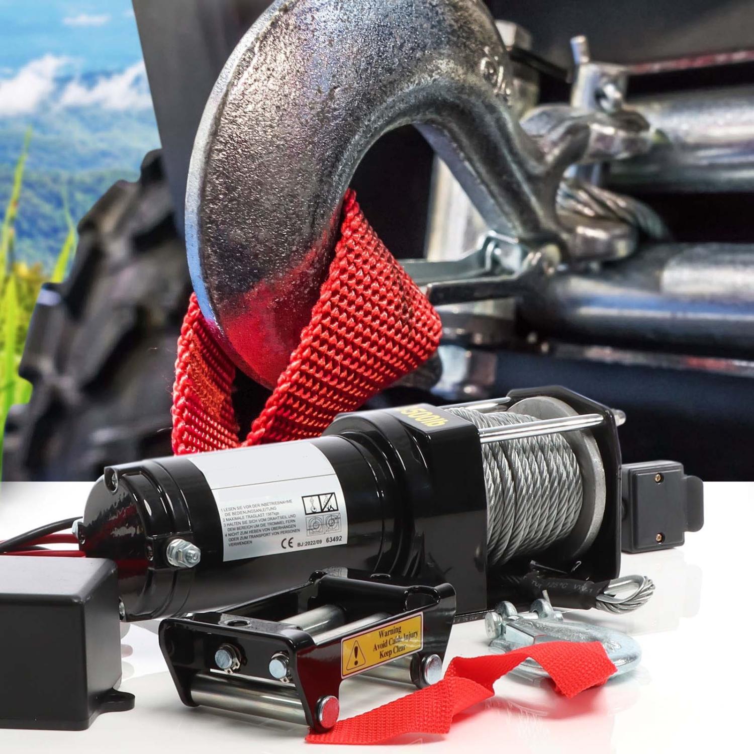 Denna elektriska vinsch är ett pålitligt verktyg för att dra tunga laster som fordon, släpvagnar eller båtar.